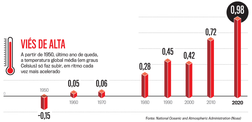 Os recordes climáticos têm sido a marca de 2021 no mundo todo, inclusive no Brasil, que atravessa a mais severa estiagem em 91 anos, vê minguar suas represas e está à beira de um colapso na produção de energia. Neste verão no Hemisfério Norte, a temperatura se mantém acima da média há sessenta dias em boa parte da Europa — os termômetros na Finlândia, Noruega e Suécia têm registrado 35 graus em regiões localizadas dentro do normalmente gelado Círculo Polar Ártico. Em consequência do calor muito além do normal, desastres pipocam por todo o continente. Na República Tcheca, um tornado repentino, o mais intenso já visto no país, causou destruição em sete cidades e deixou cinco mortos e 200 feridos. Na Ilha de Chipre, no Mediterrâneo, a luta é para conter os piores incêndios da história. A canícula se estende pelo norte da Ásia: meteorologistas russos registraram, estupefatos, abrasadores 48 graus na cidade de Verkhojansk, em plena Sibéria — isso mesmo, na Sibéria. Dando um toque de alegria em meio ao caos, os siberianos, que passam quase o ano todo recolhidos em casa por causa do frio intenso, aproveitaram o sol lotando os parques e as margens dos rios e lagos. Também a África enfrenta a pior seca em quarenta anos — metade dos 15 milhões de habitantes do Zimbábue já depende de ajuda externa para se alimentar.