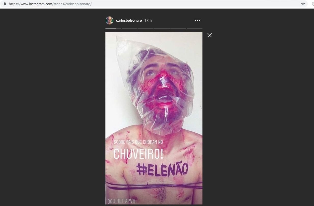 Vereador no Rio, Carlos Bolsonaro (PSL), filho do candidato à presidência da República pelo PSL, postou no Instagram nesta quarta-feira 17, uma imagem que simula a tortura de um homem, que aparece com o rosto ensaguentado, envolto em um saco plástico. Ele traz pintada, no peito, a hastag #elenão, que tem sido usada nas redes sociais contra Jair Bolsonaro. A foto foi publicada originalmente pelo artista plástico Ronaldo Creative. Em seu perfil na mesma rede social, ele declara produzir arte como forma de protesto.
