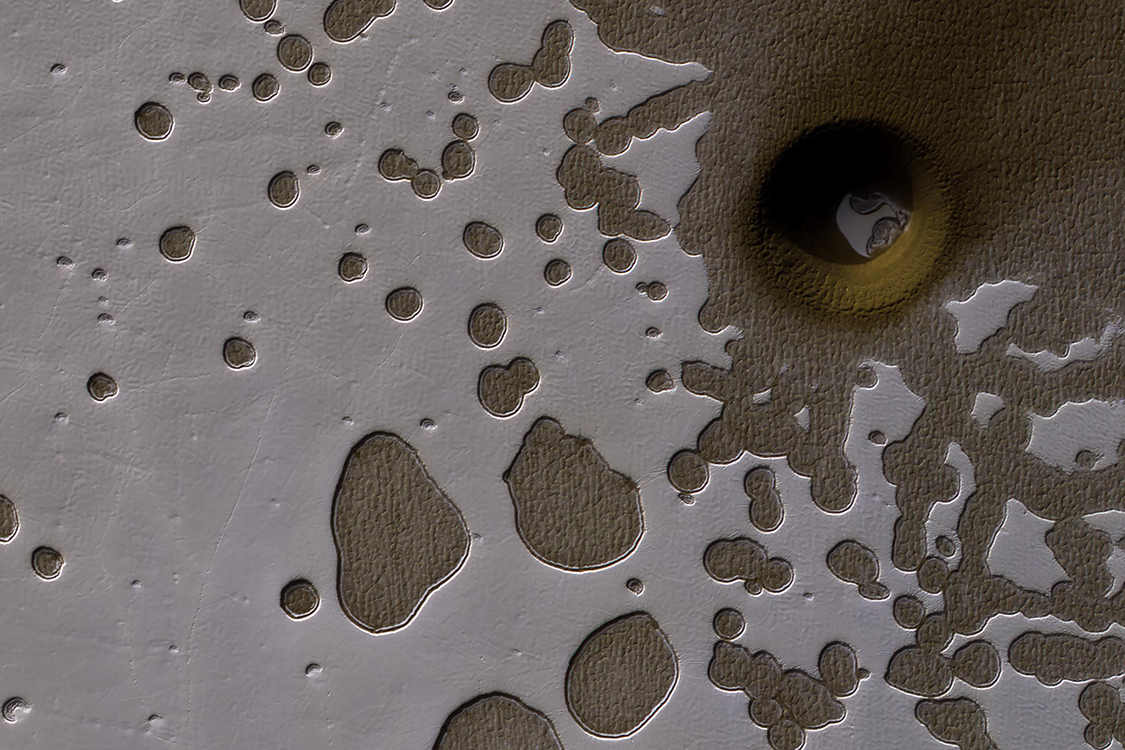 A câmera HiRISE (sigla em inglês para High Resolution Imaging Science Experiment) registrou o hemisfério Sul de Marte, no que seria o “verão” do planeta, quando o Sol está mais baixo no céu acentuando detalhes da topografia. É possível observar uma série de crateras no que resta da camada de gelo formado por dióxido de carbono da superfície – a região também é conhecida pelos cientistas como “queijo suíço”, por apresentar muitos buracos. Contudo, há uma formação circular mais profunda, que ultrapassa o gelo e a poeira da superfície, de origem ainda indeterminada. A câmera capta imagens em alta resolução, que permite aos cientistas observarem características da superfície com mais de um metro. Segundo os cálculos dos astrônomos, o “poço” deve ter centenas de metros de diâmetro.