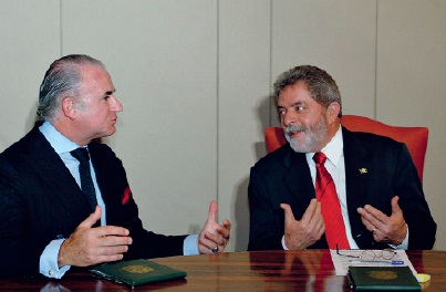 Uma das evidências processuais mais contundentes para mostrar como se organizava a quadrilha chefiada pelo ex-ministro José Dirceu foi uma reunião ocorrida em Lisboa, que teve a participação de Marcos Valério e do então presidente da Portugal Telecom, Miguel Horta (na foto com o ex-presidente Lula). Já se sabia que o motivo do encontro era buscar dinheiro para entregar ao PTB de Roberto Jefferson. Em seu depoimento, Valério acrescenta detalhes da operação. Ele revela que o ex-presidente Lula e o então ministro da Fazenda, Antonio Palocci, combinaram que uma fornecedora da Portugal Telecom em Macau, na China, transferiria 7 milhões de reais aos petistas. Valério disse que o dinheiro entrou no Brasil pelas contas de publicitários que prestaram serviços a campanhas do PT.