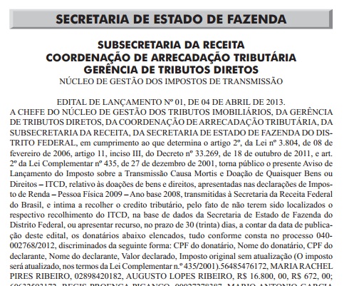 O governo do Distrito Federal publicou uma portaria cancelando a intimação que fez a milhares de contribuintes via Diário Oficial cobrando um imposto sobre transmissão de bens (Leia mais em Devassando a intimidade).