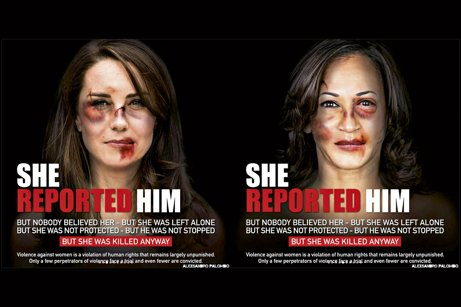 Cartazes da duquesa Kate e de Kamala Harris, a vice-presidente americana, com o rosto todo machucado, apareceram de surpresa em locais públicos de grandes cidades europeias. “Ela o denunciou. Mas não foi ouvida”, diz o texto, encerrando com “E ela acabou morta”.