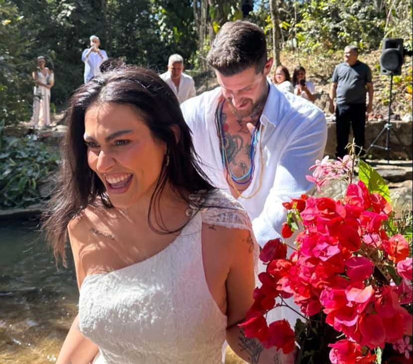 Cleo, 40, se casou pela quarta vez com o marido, o empresário Leandro Dlucca, 40, neste final de semana, em Goiás. Os dois celebraram o matrimônio em uma cachoeira na presença de poucos amigos e familiares. A cantora e atriz entrou ao lado da mãe Gloria Pires, ao som do padrasto, o cantor Orlando Morais. No local, pétalas de flores enfeitavam o caminho. Todos os presentes usaram branco e ficaram descalços durante a celebração. Na festa, Orlando também cantou com Cleo e as irmãs Antonia e Ana Morais. O casal se casou em julho de 2021, em um cartório em Passa Quatro, com poucas pessoas da família. Depois, fizeram uma comemoração no Rio de Janeiro. E por fim um casamento no candomblé.