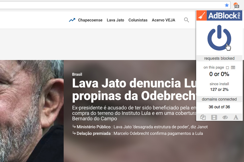 1) Clique no ícone do AdBlock Pro, localizado à direita da barra de endereços do seu navegador
