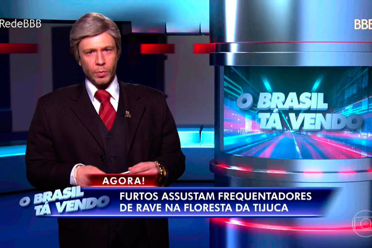 “Furtos assustam frequentadores de rave na Floresta da Tijuca”, diz o texto, enquanto aparecem imagens de Caruso dizendo que perdeu o celular — brincadeira, é claro, já que nem se pode levar celular ao confinamento da Globo.