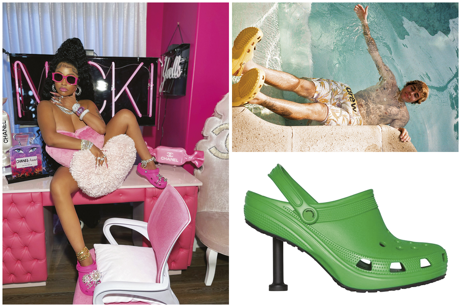 Eles já foram eleitos uma das piores invenções da história, mas hoje ocupam lugar de destaque na lista dos itens fashions mais desejados, segundo levantamento da Lyst, uma das maiores plataformas de venda e análise de comportamento do consumidor. Também estão entre os assuntos mais citados nas redes sociais. Só no TikTok são 2,1 bilhões de menções. Os crocs, os calçados que dividem o mundo entre lovers e haters, ficaram pop. Chegaram em versão dourada à cerimônia do Oscar 2021 nos pés do músico Questlove, estão no figurino da rapper Nicki Minaj em modelo com pedrinhas brilhantes formando a marca Chanel e atraíram o cantor Justin Bieber para parcerias. Outros fizeram o mesmo, assim como grandes casas da alta-costura. A italiana Gucci foi a primeira a emprestar símbolo e prestígio ao chinelo. A espanhola Balenciaga, que pertence ao mesmo grupo da Gucci, criou exemplares com salto alto para a próxima temporada primavera-verão.