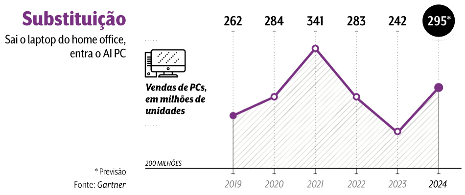 Quando a pandemia de Covid-19 prendeu todo mundo em casa, os fabricantes de computadores celebraram uma explosão de vendas para empresas e pessoas que precisavam de mais e melhores máquinas para o trabalho remoto ou o ensino a distância. Entre 2019, antes dos lockdowns, e 2021, primeiro ano cheio de home office, o mercado de PCs cresceu mais de 30% (veja o quadro). Como era de esperar, o boom tinha prazo de validade, uma vez que se trata de um produto caro e de vida útil relativamente longa, e a receita de gigantes como Lenovo, Qualcomm e Dell começou a cair. Mas surge uma nova geração de terminais, trazendo chips com até 100 vezes mais poder de processamento do que as CPUs tradicionais, e que promete convencer milhões de consumidores a trocar novamente de computador: os AI PCs. “Todos os novos PCs serão AI PCs até 2027”, vaticinou o fundador e presidente da Dell, Michael Dell, ao anunciar o lançamento da nova linha de computadores pessoais em Las Vegas. “Em pouco tempo, vamos chamá-los só de PCs, assim como chamamos os smartphones hoje simplesmente de telefones.”