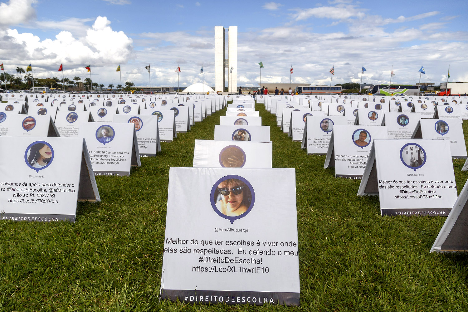 Com a hashtag #DireitoDeEscolha, a Uber está incentivando que a população se manifeste contra a proibição aos aplicativos de transporte particular. O aplicativo também organizou um protesto, com 3.000 cavaletes, colocados no gramado em frente ao Congresso.