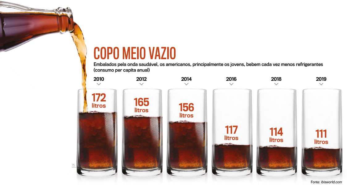Jovens empenhados em levar vida saudável, um fenômeno global, se arrepiam diante da informação de que cada latinha de Coca carrega, em média, 35 gramas de açúcar, dez a mais do que o consumo diário recomendado pela Organização Mundial da Saúde. Resultado: passado o pico do mercado, nos anos 1990, o consumo de refrigerantes nos Estados Unidos teve queda de 35%, acentuada na última década (veja no gráfico ao lado). O México, maior freguês mundial de bebidas gaseificadas, criou um imposto extra sobre refrigerantes para frear o hábito, medida adotada também por França, Noruega e Portugal. “Os jovens querem bebidas e alimentos que sejam reflexo do seu estilo de vida”, diz Rochelle Bailis, da Connexity, empresa de análise de consumo.