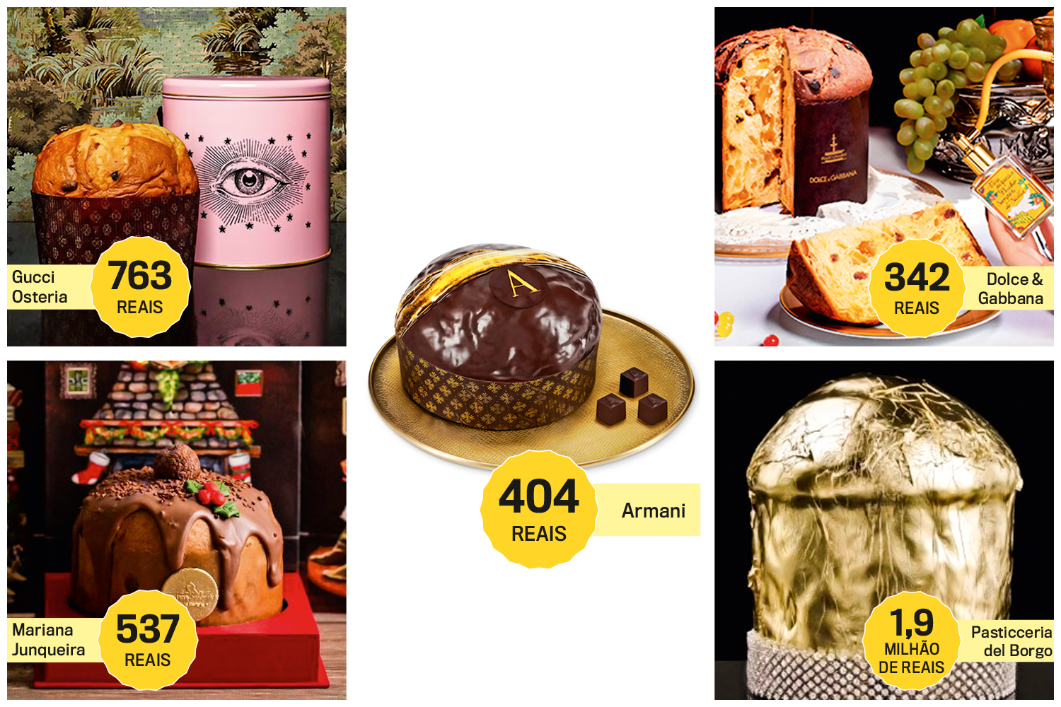 A italiana Gucci deu as mãos ao premiado chef Massimo Bottura, e, juntos, lançaram uma edição limitada de um panetone recheado com chocolate e cereja amarena, uma espécie selvagem, menor e um pouco mais ácida do que a variedade tradicional. O produto é envolvido numa bolsa de flanela macia e empacotado em uma elegante lata cor-de-rosa assinada pela marca, com o olho símbolo do Gucci Garden. Outras companhias tomaram estrada semelhante, com doses de ousadia. O pão natalino da Dolce & Gabbana vem acompanhado de borrifador contendo o vinho de sobremesa, um perpétuo Vecchio Samperi di Sicilia, para ser usado nas fatias, antes da mordida. A confeitaria Pasticceria del Borgo, em Carmagnola, no norte da Itália, criou uma versão revestida com uma folha de ouro de 22 quilates e decorado com diamantes. Dois bilionários, um russo e um indiano, compraram os seus pelo equivalente a 1,9 milhão de reais. E os comuns dos mortais? Sonham, ao apenas comer com os olhos, e disso também é feita a esperança nesta época do ano.