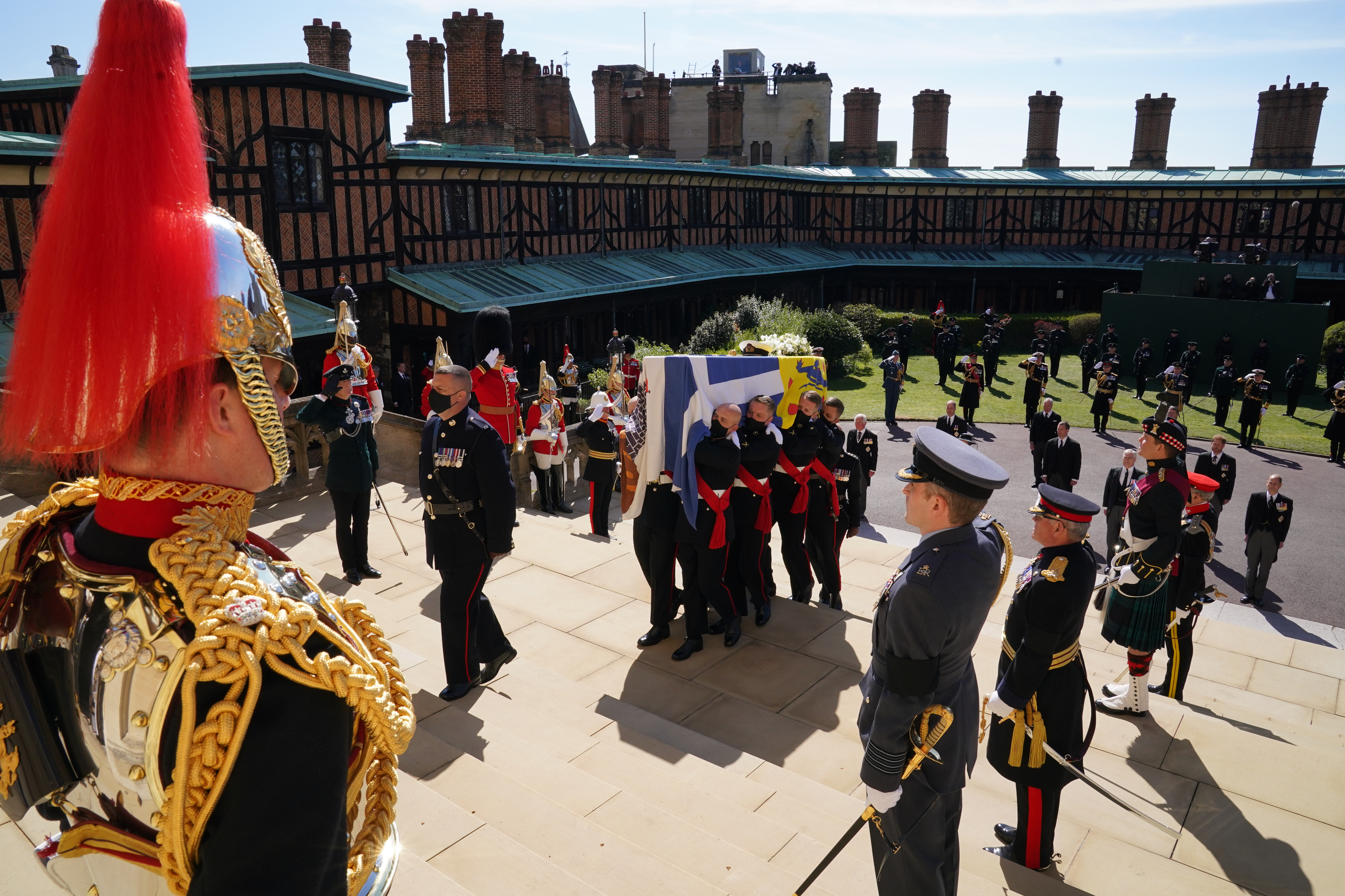 A cerimônia, no entanto, foi cercada de simbolismos e gestos que dizem muito sobre o momento delicado que a Coroa atravessa. Em traje civil, os homens da família real, acompanharam o cortejo do corpo, transportado em um veículo Land Rover adaptado, ao som da banda dos Guardas Reais. Nenhum deles usava máscara. Sobre o caixão, repousavam a bandeira, a espada e o quepe de Philip.