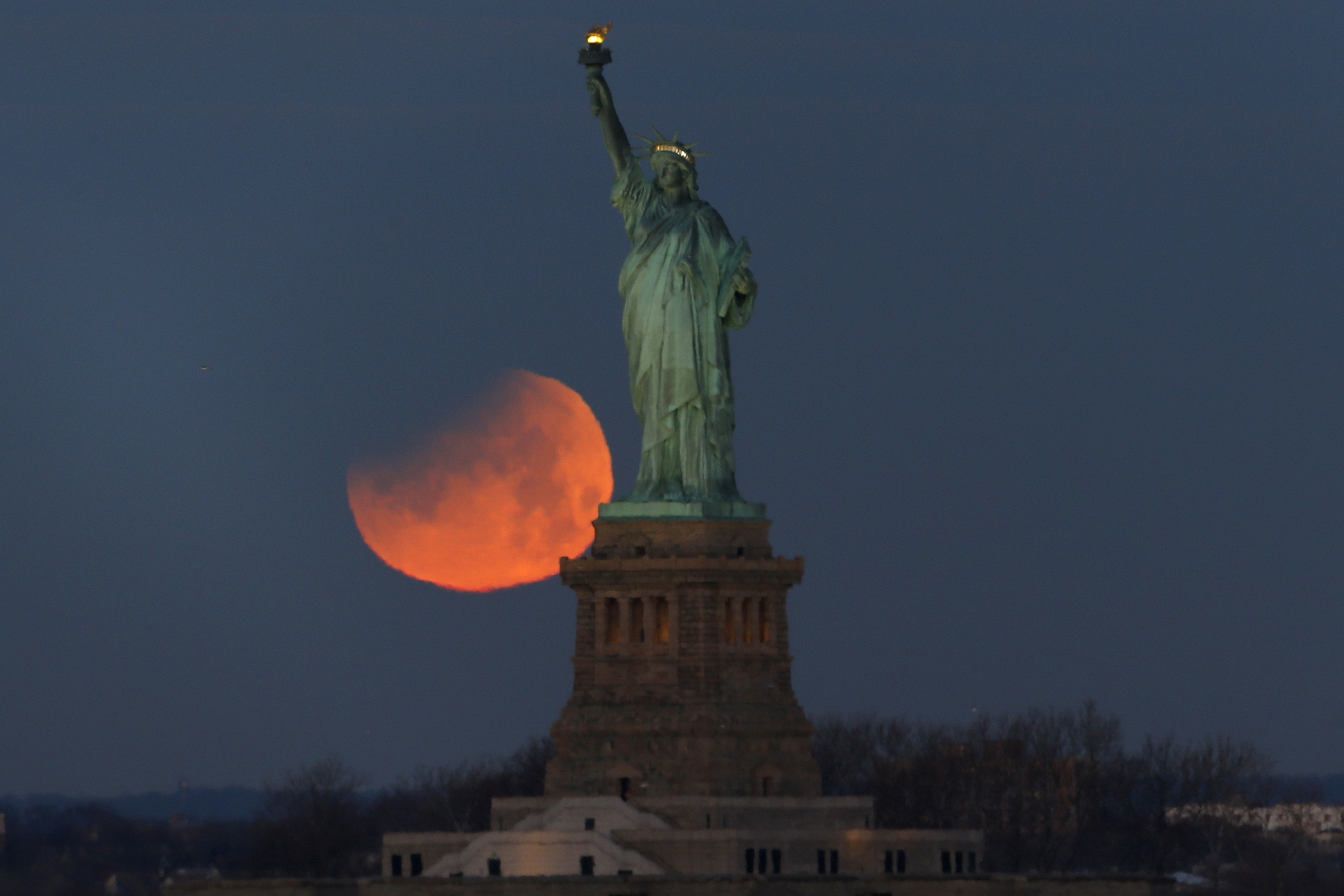 Em plena noite, milhares de pessoas se reuniram na Califórnia para ver a Lua desaparecer, privada dos raios do Sol, antes de reaparecer tingida de vermelho, daí o nome de “lua de sangue”.