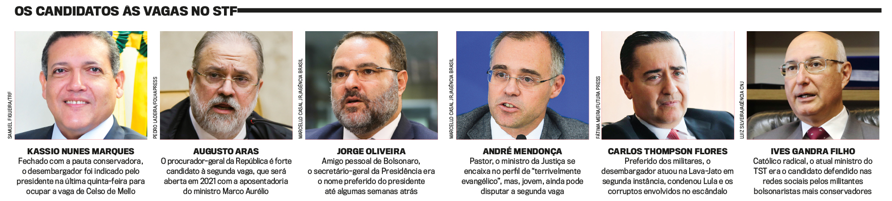 Quando o debate sobre a sucessão no Supremo começou, o presidente afirmou que poderia indicar um nome “terrivelmente evangélico” para o cargo. Ato contínuo, seu ministro da Justiça, André Mendonça, pastor da Igreja Presbiteriana, passou a constar como um dos favoritos. Entre os nomes sempre lembrados também figuravam o procurador-geral da República, Augusto Aras, o ministro da Secretaria-Geral da Presidência, Jorge Oliveira, o desembargador gaúcho Thompson Flores e o ministro Ives Gandra Filho (veja o quadro abaixo). A Constituição exige que o indicado tenha entre 35 anos e 65 anos, notório saber jurídico e reputação ilibada. Não era difícil achar quem se enquadrasse nesses requisitos. Na semana passada, apareceu o azarão: o desembargador Kassio Nunes Marques, do Tribunal Regional Federal da 1ª Região, em Brasília. Na terça-feira 29, Bolsonaro foi com Marques à casa do ministro do STF Gilmar Mendes para avisar o anfitrião de que o desembargador seria o substituto de Celso de Mello.