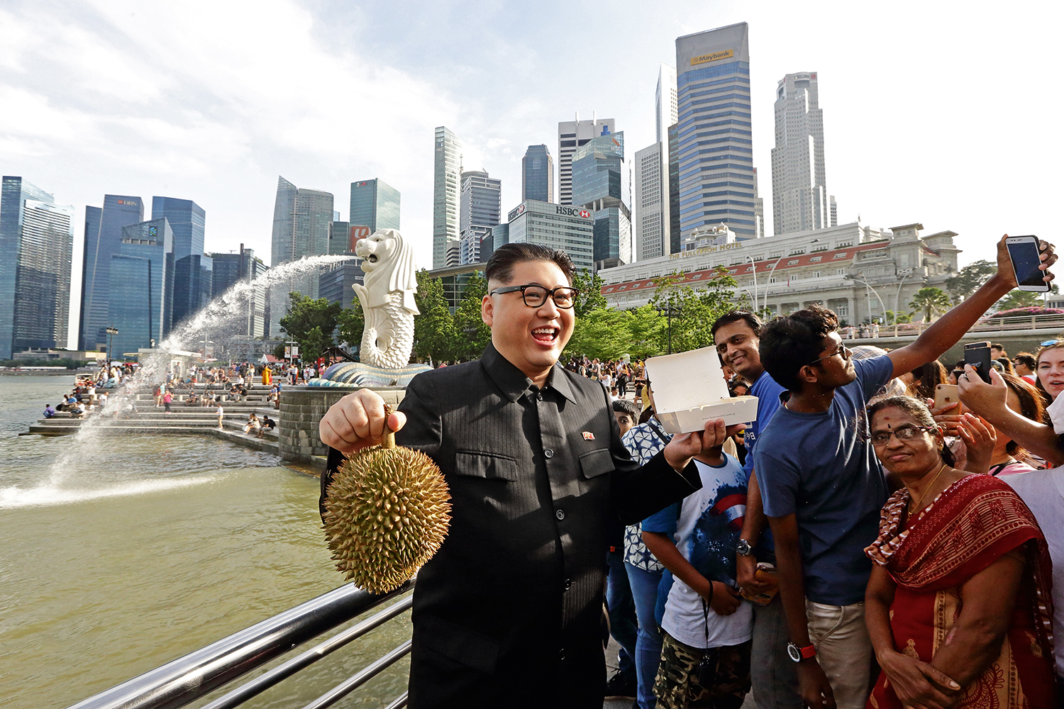 “Com isso aqui vai dar para alimentar uma vila inteira quando eu voltar para a Coreia do Norte”, disse um alegre Kim Jong-un enquanto segurava o durião, uma jaca espinhenta típica da Ásia, e uma bandeja de arroz com frango. Ao passear animadamente por um dos calçadões mais movimentados de Singapura, ele ficou deslumbrado com o que viu. “Aqui é como Pyongyang, exceto pelo fato de ter internet rápida, comida boa e muito dinheiro”, afirmou, ostensivamente cercado por turistas. O detalhe: era tudo brincadeira, tudo farsesco. O Kim Jong-un da foto é uma criação do sino-australiano Howard X (nome artístico). Baterista, ele chegou a estudar música por dois anos em várias cidades do Brasil, e hoje é um respeitado produtor de bandas de bossa nova com sotaque chinês. Nos últimos cinco anos, tem faturado também como empresário de outro artista, o americano Dennis Alan, que personifica o presidente Donald Trump. Mas diverte-se mesmo encarnando o ditador da Coreia do Norte.
