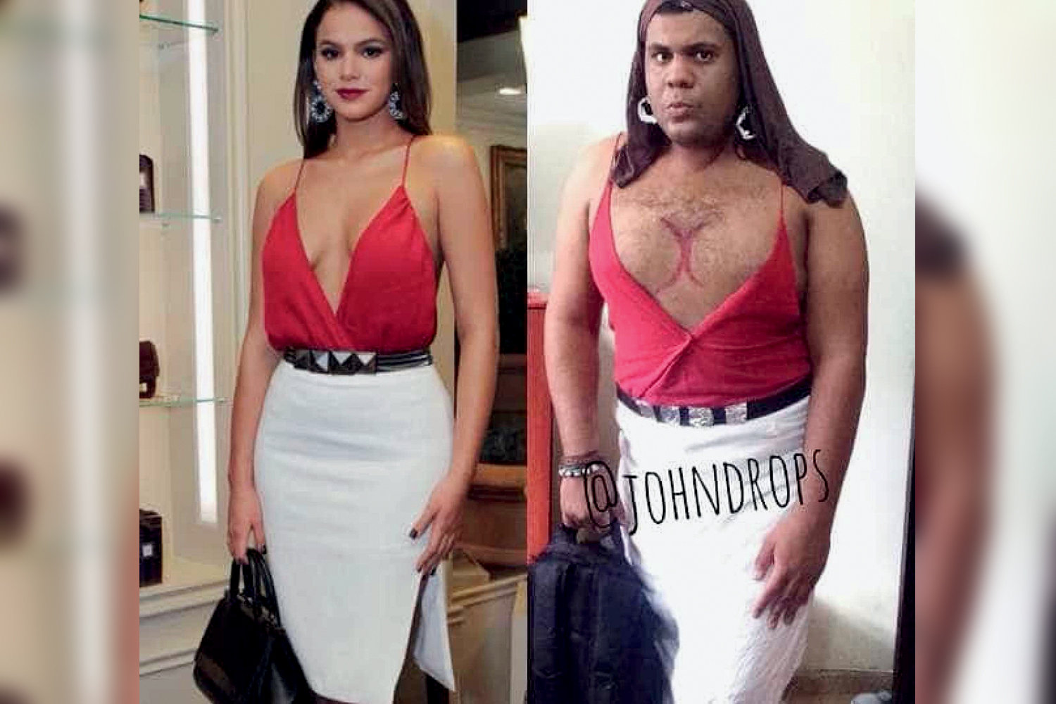 Na imagem 1, o original: uma mulher linda posa de blusinha decotadíssima, saia justa, cintura fina acentuada por um cinto com detalhes prateados, longos cabelos lisos. Na imagem 2, a imitação: um homem, de barba, blusa improvisada com dois panos de prato amarrados, curva dos seios desenhada a caneta no peito cabeludo, saia de toalha de banho, cinto de saco de lixo e papel-alumínio. Postadas lado a lado no Instagram, as fotos foram curtidas por quase 100 000 fãs. A beldade original é Bruna Marquezine. O imitador estapafúrdio é John Drops, expoente de um tipo de humor que vem reunindo seguidores aos milhares, até milhões, na internet: a paródia deliberadamente escrachada de famosos no auge do glamour. “Assisto e me divirto”, diz o humorista Antonio Tabet. “O que determina se um tipo de humor vai ou não vingar é só uma coisa: ser engraçado. E este é.”