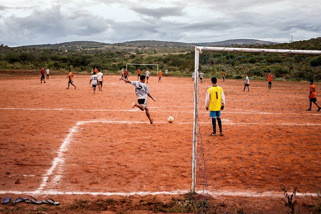 A geografia daquele pedaço é peculiar. O time que ataca o gol voltado para o vilarejo atua em desvantagem, pois o terreno inclinado faz com que seus jogadores tenham de correr morro acima, esbaforidos. Já quem chuta a bola no sentido contrário, como faz o peladeiro da foto acima, deve tomar cuidado. Se a bola rolar demais e encostar em um quiabento, planta espinhosa típica da caatinga, é fim de jogo, com o couro furado. Nada que diminua o ímpeto da turma, sempre homens, que todo sábado, todo domingo bate ponto entre as traves, palco de uma das paradas da Expedição Vozes do Futebol, organizada por VEJA com o apoio da Mercedes-Benz.