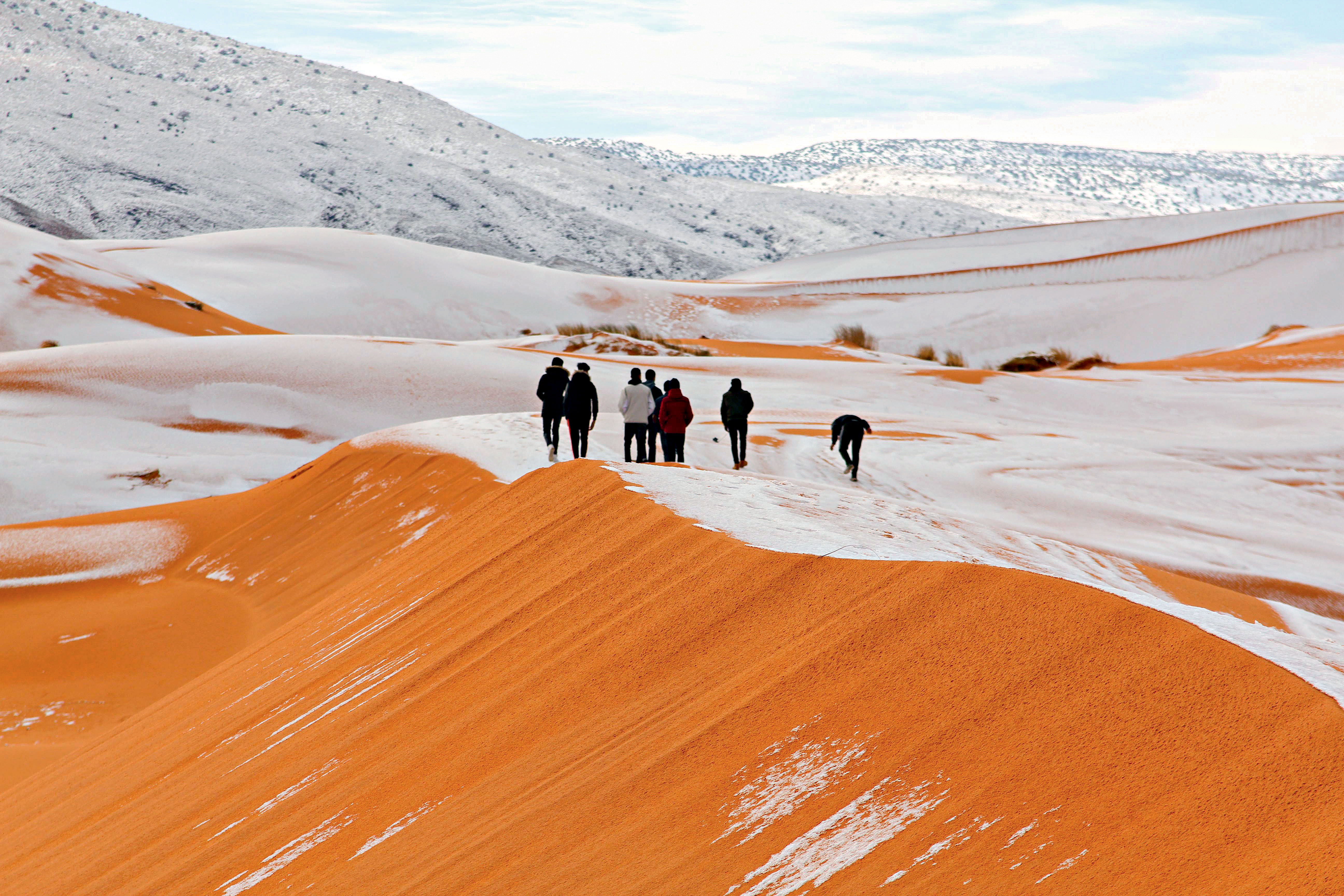 Os moradores da pequena cidade de Ain Sefra, na Argélia, estão habituados à vista do Saara. Criada pelos franceses em 1881 como um posto militar avançado, a vila é uma das portas de entrada para o deserto no país. Apesar de seu tamanho modesto, Ain Sefra enfrentou episódios famosos, como uma enchente-relâmpago que dizimou a vila em 1904 e a Batalha de MZI, uma das principais na guerra de independência argelina, em 1960. Na semana passada, seus habitantes ganharam notoriedade por outro motivo: a neve. As imagens das dunas cobertas por um manto de gelo em Ain Sefra impressionaram pelo contraste de cores, fenômeno que já ocorreu pelo menos em duas outras ocasiões nas últimas quatro décadas. Apesar das baixíssimas temperaturas à noite, o deserto dificilmente tem neve, devido à falta de umidade. A pintura branca foi gerada por uma rara corrente de ar úmido vinda do Atlântico Norte. A neve no Saara, associada às tremendas tempestades de inverno que açoitam a costa leste dos Estados Unidos, assanhou os negacionistas, assim chamados os que negam peremptoriamente o aquecimento global. Eles foram às redes sociais para apresentar as imagens de neve como prova de suas convicções. Com isso, promovem uma confusão elementar, misturando dois conceitos: o tempo (que se refere ao estado da atmosfera a curto prazo, ontem, hoje ou amanhã) e o clima (que diz respeito ao estado da atmosfera em longos períodos). É por isso que o tempo pode estar frio, com nevascas intensas, mas o clima pode estar ficando gradualmente mais quente. Não é só em Ain Sefra que os tempos andam estranhos.