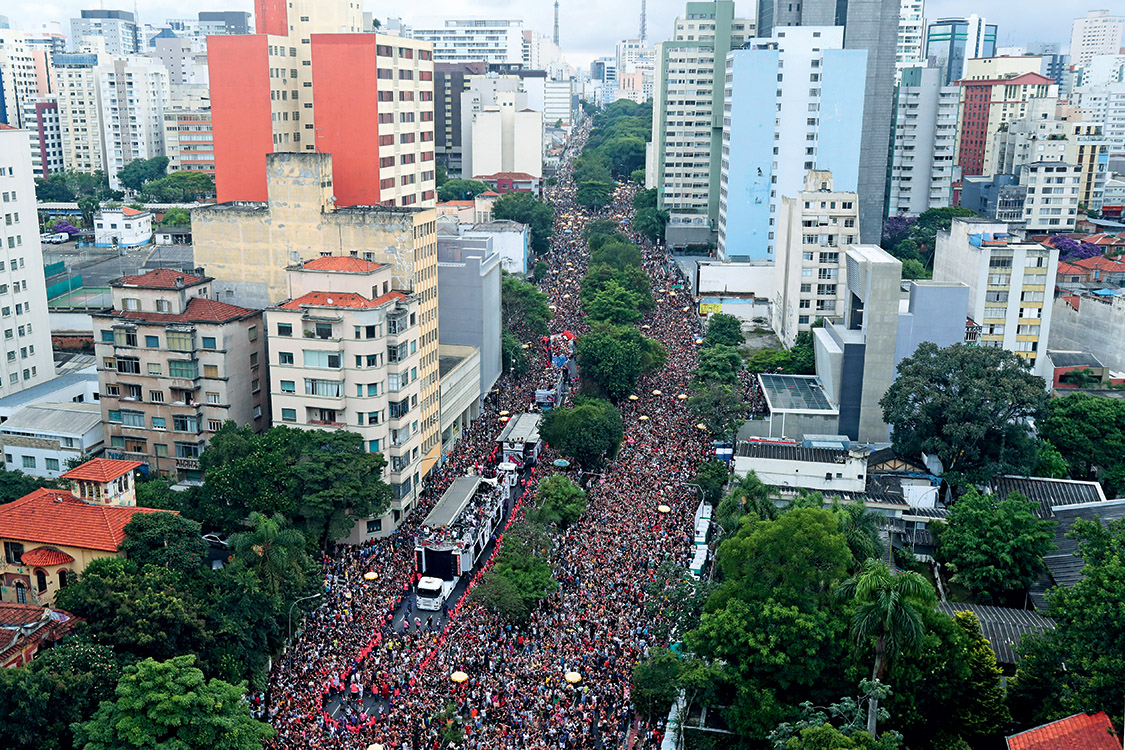 Em 1960, quando Vinicius de Moraes atribuiu a São Paulo a pecha de “túmulo do samba”, não estava dizendo que os paulistanos eram incapazes de composições dignas do ritmo, apenas que não havia bons lugares para apreciá-lo na cidade. Não se pode dizer que, quase sessenta anos depois, a explosão do Carnaval de rua em São Paulo seja suficiente para enterrar a expressão. Até porque samba é o que menos se escuta nos 491 blocos cadastrados para desfilar entre 3 e 18 de fevereiro. Competem frevo, axé, funk e até rock com levada de marchinha. Mas é com esse ecletismo que o Carnaval de rua paulistano caminha para se tornar neste ano o maior do Brasil. Foram quase 4 milhões de foliões só no primeiro fim de semana. Em comparação, no Rio de Janeiro o público do pré-Carnaval foi estimado em 1,7 milhão e, em Salvador, em 1 milhão. No ano passado, os blocos cariocas reuniram 5,9 milhões de pessoas durante todo o período de festa. O Galo da Madrugada, o maior bloco do país, no Recife, espera atrair 2 milhões no sábado 10. O gigantismo do folguedo paulistano, porém, expôs algumas falhas de planejamento da prefeitura e dos organizadores autorizados a faturar com os patrocínios da festa. Houve tumulto com o fechamento de estações de metrô e mortes em uma briga motivada pela falta de banheiros químicos. No bloco Acadêmicos do Baixo Augusta, com 1 milhão de pessoas (acima), um estudante morreu eletrocutado ao encostar em um poste com câmeras de segurança instaladas às pressas. O prefeito João Doria previa que 4 milhões de pessoas tomariam as ruas de São Paulo durante todo o Carnaval. Já está claro que a conta subestimou, e muito, o que estava por vir.