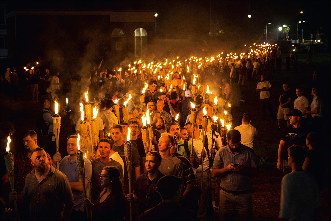De improviso, entre uma careta e outra, o presidente americano Donald Trump esparrama fagulhas que podem se transformar em incêndios catastróficos em lugares distantes do planeta. Nas últimas semanas, ele prometeu levar “fogo e fúria como o mundo jamais viu” à Coreia do Norte e ameaçou recorrer à opção militar contra a Venezuela. Mas foi na cidade de Charlottesville, que fica a apenas duas horas e meia de carro da Casa Branca, que as suas faíscas evoluíram para labaredas perigosas. Na sexta 11, 500 pessoas, praticamente só homens, acenderam tochas e carregaram bandeiras nazistas e dos estados confederados, que lutaram pela manutenção da escravidão na Guerra Civil americana (1861-1865). Elas protestavam contra a retirada da estátua de Robert E. Lee, um general confederado, e gritavam palavras de ordem repulsivas, como “judeus, vocês não vão nos substituir” e “a vida dos brancos importa”, em contraposição clara à vida dos negros. Foi a maior manifestação aberta de ódio racial em pelo menos uma década nos Estados Unidos. No dia seguinte, a coisa só piorou. O jovem James Fields Junior, de 20 anos, que participou do grupo racista Vanguard America, avançou com um carro cinza contra manifestantes antirracistas. Matou uma mulher, Heather Heyer, de 32 anos, e feriu dezenove pessoas.