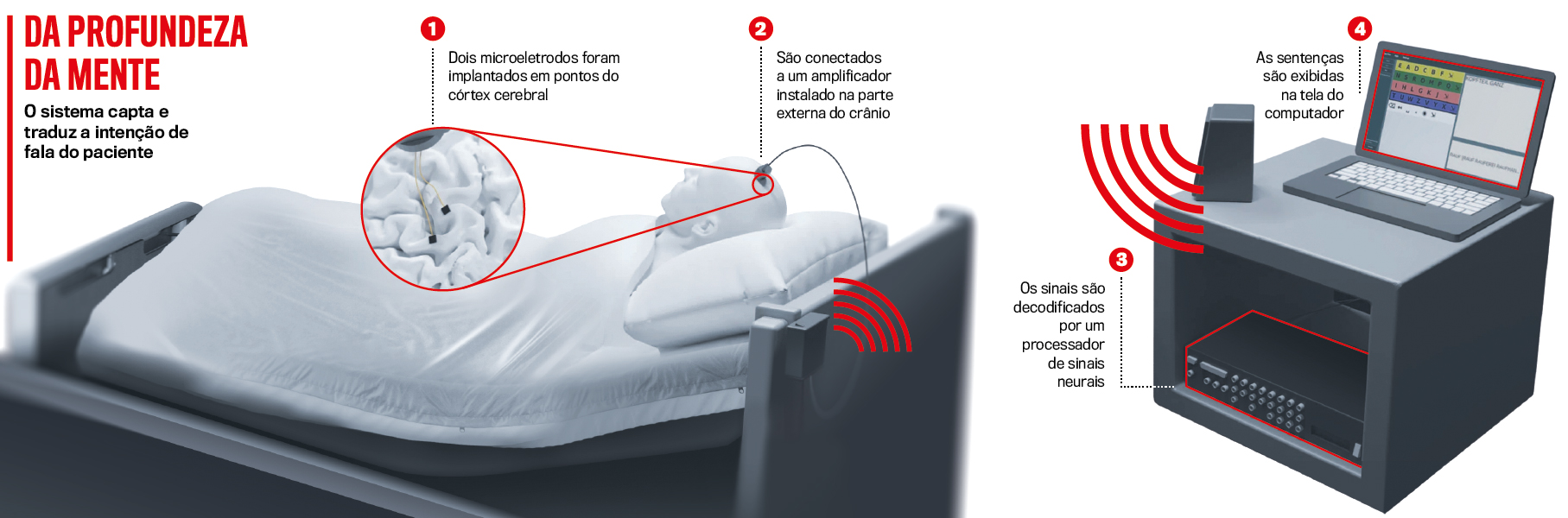 Os dispositivos foram conectados a um sistema de tradução instalado no quarto do paciente (veja acima). Depois de muito treino, ele estava apto a selecionar mentalmente as letras de um teclado virtual. Tipo a tipo, as frases começaram a ser formadas. Na medida em que os olhos se fechavam, expandiam-se no cérebro o vocabulário e a velocidade com que os caracteres eram mencionados até alcançarem a marca de um a cada minuto. No dia 253 pós-implante, o paciente perguntou ao filho se gostaria de ver o filme Robin Hood, da Disney, brincou pedindo batata com curry e que pusessem cerveja no tubo de alimentação. Ainda disse à mulher que colocasse para tocar músicas da banda americana Tool. A declaração de amor ao filho significou o ápice desse processo. A história está relatada em artigo publicado na revista científica Nature Communications. Depois, contudo, o paciente perdeu a capacidade de se comunicar tão sofisticadamente, provavelmente porque o cérebro rejeita os implantes e os sinais elétricos estão mais fracos. É tolo, no entanto, pensar que o esforço foi em vão. As vitórias entregaram à medicina um horizonte de possibilidades. “Quanto mais cedo o sistema for adotado, melhores serão os resultados”, disse a VEJA Jonas Zimmermann, um dos médicos da equipe. “Mas teremos de trabalhar com outros pacientes e segui-los ao longo dos anos para obter os dados de que precisamos.” É isso. A voz da mente do rapaz alemão é apenas o começo de mais uma magnífica estrada trilhada pelo ser humano.